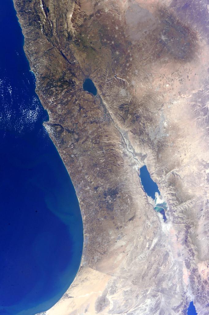 La frontiere avec l'Egypte, la mer morte qui se reduit et disparait : l'astronaute Terry W. Virts, qui sejourne actuellement dans la sation spatiale internationale, a photographie notre voisinage. Ca a l'air calme de l'espace.